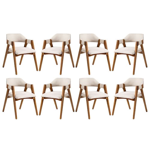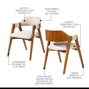 Você está buscando uma cadeira que seja o destaque do seu ambiente? Então, você precisa conhecer a Cadeira Lua! Com um design moderno e elegante, ela é capaz de conceder maior conforto a qualquer espaço. Além de sua beleza estética, a Cadeira Lua é incrivelmente versátil e pode ser usada em diversos ambientes da sua casa, trazendo um toque único a cada um deles. Produzida com madeira maciça sustentável de alta qualidade e resistência, você pode ter certeza de que esta cadeira durará por muitos anos. Não perca mais tempo procurando a cadeira perfeita. Então não perca mais tempo e venha conhecer nosso catálogo e deixar sua casa mais completa e cheia de estilo com todos os produtos da Rio Madeira Interiores. CARACTERÍSTICAS TÉCNICAS: - Produzido em Madeira Maciça Sustentável - Acabamento em Verniz na cor Imbuia - Assento Estofado Preenchido com Espuma D23 - Encosto Estofado Preenchido com Espuma D18 - Revestimento Impermeável em Linho Bege L60 - Cadeira Entregue Semi Montada *Kit Composto por OITO Cadeiras INFORMAÇÕES TÉCNICAS: Altura Total: 80 cm Altura Chão até Braço: 69 cm Altura Chão até Assento: 50 cm Altura Encosto: 32 cm Largura Total: 62 cm Largura do Assento: 55 cm Profundidade Total: 60 cm Profundidade Assento: 53 cm Peso: 8 kg INFORMAÇÕES ADICIONAIS: Garantia para defeitos de fabricação conforme Código de Defesa do Consumidor. - Produto em madeira maciça natural, podendo ocorrer variação no tom ou cor da madeira. - As imagens ambientadas são meramente ilustrativas e podem apresentar itens que não compõe o produto, as cores do produto podem variar de acordo com o monitor, a iluminação do ambiente ou sua percepção visual. - Limpeza: Deve ser feita com pano macio e seco ou levemente umedecido com água e sabão neutro. Não devem ser utilizados abrasivos. Marca: Rio Madeira Interiores