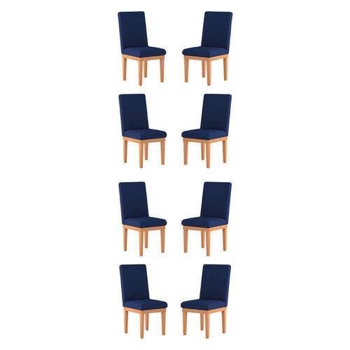 Kit 8 cadeiras estofadas reforçadas para sala de jantar Cor: azul marinho A cadeira reforçada estofada traz muita segurança e conforto para seu ambiente de jantar. Sua estrutura é 100% em madeira eucalipto e todo conforto se deve a espuma com densidade d-23. Com um design sofisticado, a cadeira conta com acabamento em suede. Qual o material utilizado - tecidos suede;- espuma d-23;- percintas elásticas;- estrutura 100% madeira eucalipto;- pés madeira de eucalipto. Produto suporta até 120 kg. Garantia de fábrica de 03 meses contra defeito de fabricação. Instruções de montagem:Produto montado, sendo necessário apenas rosquear os pés. Observações importantes: -todos os produtos vão embalados com total segurança. - pode haver alguma diferença de tonalidade entre a imagem e o produto, por conta do tratamento de imagens e a calibração de cores da sua tela. Modo de limpeza: - limpar com pano limpo e moderadamente úmido Especificações técnicas Travamento da estrutura com grampos em aço galvanizados e parafusos com flange de 5 mm;Madeira de reflorestamento eucalipto;Tecido suede 100% poliéster. Dimensões Altura: 94 cmLargura: 43 cmProfundidade: 55 cmPeso: 5 kg