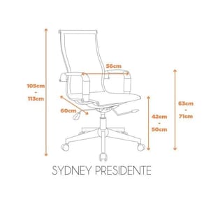 A cadeira Sydney Presidente é toda em tela com aço cromado. A tela garante resistência e conforto para quem estiver usando, além de também possuir seus braços revestidos, para que a pele não entre em contato com o metal direto. Ela possui um assento alongado, o que a torna perfeita para salas de diretoria e mesas de reunião, além de possuir o sistema relax para que seja melhor para seus usuários, travando na vertical, ou balançando de acordo com o movimento do corpo. Altura do Conjunto: 113 cm Ambiente: null Ambiente Principal: Escritório Cor: Cinza Informação Complementar: 8x Cadeira Para Escritório Presidente Giratória Aço Cromado Sidney Cinza Largura: 56 cm Altura: 113 cm Peso: 9,47 kg Profundidade: 60 cm Necessita Montagem: Sim