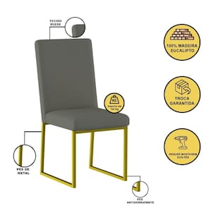 Você receberá 4 volumes, ou seja, oito Cadeiras Estofadas para Mesa de Jantar com Base Industrial Dourado.