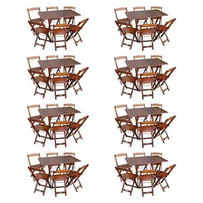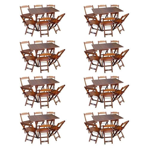 Kit 8 Conjuntos De Mesa Dobráveis De Madeira 70x110cm Com 6 Cadeiras ImbuiaO Conjunto Dobrável é ideal para bares, restaurantes, estabelecimentos, áreas de lazer e também para sua casa. Em madeira tornando-os resistentes e duráveis, seu design permite que esse conjunto seja encaixado em qualquer ambiente, trazendo um toque a mais para seu estabelecimento. Além de sua durabilidade, o que lhe trará conforto para servir seus clientes. Por ser dobrável torna-se mais fácil guardar, manusear e limpar o produto.Tipo: ConjuntoModelo: DobrávelCor: ImbuiaMEDIDASDIMENSÕES DA MESAAltura 77cmLargura: 110cmProfundida: 70cmDIMENSÕES DA CADEIRAAltura da cadeira aberta 78cmAltura da cadeira fechada 89cmAltura até o assento 46cmLargura 41,5cmLargura vão do assento 37,5cmProfundidade 40cmProfundidade do assento 32cmATENÇÃO: EVITE USAR PRODUTOS ABRASIVOS E QUÍMICOS PARA LIMPEZA DO PRODUTO, aconselha-se o uso de pano umedecido para melhor conservação; mantenha o produto fora de chuva e sol constantes.IMAGENS MERAMENTE ILUSTRATIVAS, PODENDO HAVER UMA PEQUENA VARIAÇÃO DA TONALIDADE DA COR DEPENDENDO DE CADA TELA, MONITOR E ATÉ MESMO PERCEPÇÃO VISUAL DE CADA UM.Kit 8 Conjuntos de Mesa DobrÃveis de Madeira 70x110cm com 6 Cadeiras Imbuia