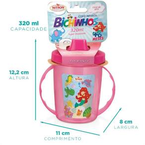 Cor: Rosa Tema: Bichinhos Material: Polipropileno Com Alça e Tampa com Bico Capacidade: 320ml Idade Recomendada: +6meses Medidas: 12 x 8 x 11 cm CxAxL Peso: 50g Marca: Nitronplast Cód Fornecedor: 227