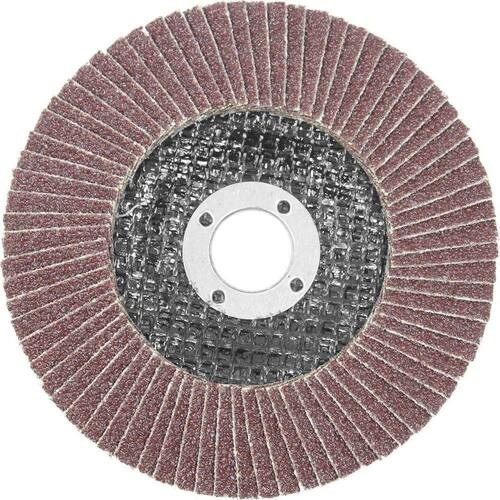Disco de desbaste tipo flap sextavado e feito de lixas retangulares na base de tecido que são situadas como um leque com fibra de vidro como material de base. em trabalhos de polimento de metal, madeira e outros materiais.