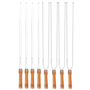 Para churrasqueiros que prezam por estilo, qualidade e funcionalidade, o Kit com 8 Espetos Mor da Linha Premium é a escolha ideal. Composto por 4 espetos simples e 4 espetos duplos, todos com 80 cm de comprimento total, o kit oferece praticidade e excelente desempenho no preparo de carnes, legumes e acompanhamentos na churrasqueira. Fabricados com lâmina de alumínio polido, os espetos são leves, resistentes e duráveis. O cabo de madeira anatômico proporciona manuseio seguro, confortável e com proteção térmica. A Linha Premium da Mor combina elegância e eficiência para tornar cada churrasco ainda mais especial. Composição do kit: 4 espetos simples de alumínio - 80 cm 4 espetos duplos de alumínio - 80 cm Destaques do produto: Linha Premium Mor: acabamento refinado e alto desempenho Lâmina em alumínio polido: mais leveza e resistência Cabo de madeira anatômico: conforto térmico e segurança no manuseio Espeto duplo: ideal para cortes maiores que exigem mais estabilidade Espeto simples: versátil para carnes fatiadas, legumes e pães Ideal para churrasqueiras residenciais e uso frequente Especificações técnicas por unidade : Material da lâmina: Alumínio polido Material do cabo: Madeira Comprimento total: 80 cm Comprimento da lâmina: 63 cm Comprimento do cabo: 17 cm Diâmetro da lâmina: 6,35 mm Observação: Imagens meramente ilustrativas. Os objetos de ambientação não acompanham o produto. Marca: Não Informado Ean: 7898762848007
