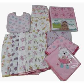 Este kit contém 1 Toalha felpuda 70x90cm com capuz 4 Fralda de boca 33x33cm estampada com crochê feito a máquina 4 Fralda luxo estampada 70x70cm com crochê feito a máquina 2 Cueiro flanelado estampado 80x80cm com crochê feito a máquina 1 Cueiro flanelado 80x80cm bordado com crochê feito a máquina 1 Kit babador com 3 unidades Detalhe dos produtos: Tecido fraldas: macia dupla 100% algodão Tecido toalha: 100% algodão Tecido cueiro: flanelado 100% algodão Tecido babadores: 100% algodão, forro em PVC Cores: para menina Marca DUGU Marca: Não Informado