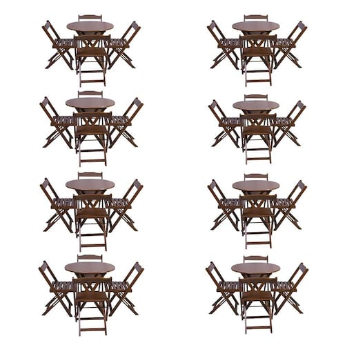Kit 8 Jogos De Mesa Dobravel Com 4 Cadeiras Tampo Redondo 70x70 Imbuia é ideal para bares, restaurantes, estabelecimentos, áreas de lazer e tambem para sua casa. Feito em madeira maciça, tornando resistentes e duráveis. Seu design permite que seja encaixado em qualquer ambiente, trazendo um toque a mais para seu estabelecimento. Além de sua durabilidade, o que lhe trará conforto para servir seus clientes. Por ser dobrável torna-se mais fácil guardar, manusear e limpar o produto. Atenção: EVITE USAR PRODUTOS ABRASIVOS E QUíMICOS PARA LIMPEZA DO PRODUTO, aconselha-se o uso de pano umedecido para melhor conservação; mantenha o produto fora de chuva e sol constantes