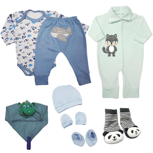 1 MACACÃO PLUSH 1 KIT TOCA (3 Peças) 1 NANINHA 1 CONJ BODY E MIJÃO 1 PANTUFA Total= 8 Peças