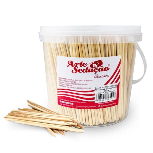 - palitos de ponta dupla; - a ponta fina é ideal para empurrar suavemente as cutículas e limpar os cantos das unhas com precisão; - a ponta chanfrada é perfeita para remover delicadamente a pele morta e criar uma linha limpa ao redor das unhas; - com 800 unidades no balde, você terá ampla quantidade de palitos para vários atendimentos de manicure e pedicure; - alta qualidade; - palitos firmes; - madeira pinus; - balde resistente.