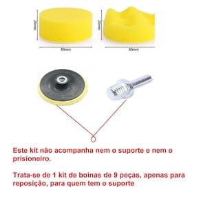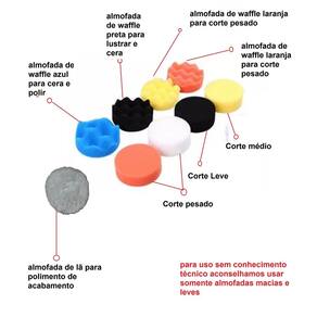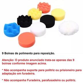 Kit com 9 boinas de polimento em espuma e lã, ideal para reposição em suportes com tiras aderentes de 80mm. As boinas apresentam diferentes níveis de abrasividade, indicadas para corte pesado, médio e leve, além de boinas para lustro, cera e acabamento. Compatível com politriz ou furadeira, desde que o usuário já possua o suporte e o adaptador prisioneiro . Atenção: Este kit é composto apenas pelas 9 boinas conforme imagens. Não acompanha suporte para politriz. Não acompanha prisioneiro para furadeira. Não acompanha furadeira, parafusadeira ou politriz.