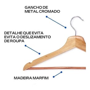 Kit 9 cabides madeira marfim verniz adulto barra blusa calça