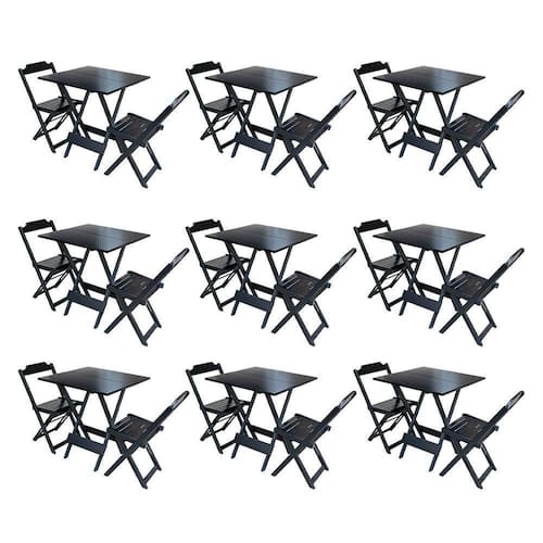 Kit 9 Conjuntos De Mesa Dobravel Com 2 Cadeiras De Madeira 70x70 Para Restaurante E Bar - PretoO produto é ideal para bares, restaurantes, estabelecimentos, áreas de lazer e também para sua casa. Feito em madeira maciça, tornando resistentes e duráveis. Seu design permite que seja encaixado em qualquer ambiente, trazendo um toque a mais para seu estabelecimento. Além de sua durabilidade, o que lhe trará conforto para servir seus clientes. Por ser dobrável torna-se mais fácil guardar, manusear e limpar o produto.Atenção: EVITE USAR PRODUTOS ABRASIVOS E QUÍMICOS PARA LIMPEZA DO PRODUTO, aconselha-se o uso de pano umedecido para melhor conservação; mantenha o produto fora de chuva e sol constantes.OBS: MDF ULTRATipo: Kit 9 Conjuntos de Mesa 2 Cadeiras Modelo: DobrávelCor: Preto Medidas Mesa:Altura: 76cmLargura: 70cmComprimento: 70cmMedidas Cadeiras:Altura: 80cmLargura: 45cmComprimento: 42cmOBS: Evite usar produtos abrasivos e químicos para limpeza do produto, aconselha-se o uso de pano umedecido para melhor conservação; mantenha o produto fora de chuva e sol constantes.ATENÇÃOIMAGENS MERAMENTE ILUSTRATIVAS REALIZADO EDIÇÃO, PODENDO HAVER UMA PEQUENA VARIAÇÃO DE COR DEPENDENDO DE CADA TELA OU MONITOR.Kit 9 Conjuntos de Mesa Dobravel com 2 Cadeiras de Madeira 70x70 para Restaurante e Bar - Preto