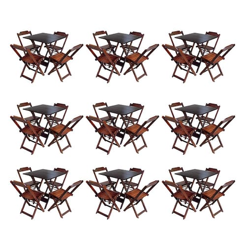 Kit 9 Jogos De Mesa Dobravel Com 4 Cadeiras De Madeira 70x70 Para Restaurante E Bar - Imbuia O produto é ideal para bares, restaurantes, estabelecimentos, áreas de lazer e também para sua casa. Feito em madeira maciça, tornando resistentes e duráveis. Seu design permite que seja encaixado em qualquer ambiente, trazendo um toque a mais para seu estabelecimento. Além de sua durabilidade, o que lhe trará conforto para servir seus clientes. Por ser dobrável torna-se mais fácil guardar, manusear e limpar o produto.