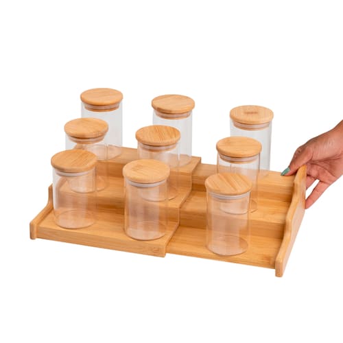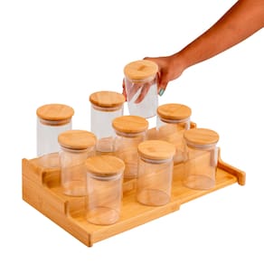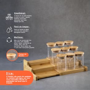 Esse é o kit 9 potes hermético 200ml com tampa de bambu e rack organizador de bambu - OikosEsse Kit contém:1 Rack organizador extensível de bambu - oikos9 Potes 200ml de vidro com tampa de bambu circular mantimento – oikosEsse é o rack organizador extensível de bambu da OIKOS. Funcional: seus objetos sempre à mostra e bem acomodados, mais praticidade na hora de guardar ou servir.Expansível: é só deslizar que ele se adapta ao tamanho da bancada ou do armário, deixando o seus espaços mais otimizados. Versátil: pra guardar, servir e decorar. organiza temperos, frascos, plantas e mais!Decorativo: o design atemporal e o tom natural combinam com diversas decorações. deixando os ambientes mais charmosos e convidativos.Feito de bambu: material leve, resistente e ecologicamente correto. Durável e higiênico: o bambu é resistente e tem propriedades que evitam a proliferação de bactérias, assim como o mármore. só precisa lavar e secar de acordo com as recomendações, combinado?Dimensões do produto:Comprimento: 22cmAltura: 21cmLargura: 8,5cmEsses são os potes de vidro hermético redondo de 200ml para mantimentos com tampa de bambu da OIKOS. Não julgue pelas aparências, ele não é só um potinho bonito: com a combinação da vedação de silicone e o bambu antibactericida, esse pote se torna um verdadeiro mestre na conservação de alimentos! E não é só de comida que vive esse pote: além de tempero, açúcar e sal, nele também cabe purpurina, algodão, moedas, grãos, clipes, grampos, elásticos e outras pequenices que você quiser guardar - isso que é versatilidade.