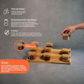 Esse Kit contém:br / 1Rack organizador extensível de bambu - oikosbr / 9Potes 110ml de vidro com tampa de bambu circular mantimento - oikosbr / Esse é o rack organizador extensível de bambu da OIKOS. br / Expansível: é só deslizar que ele se adapta ao tamanho da bancada ou do armário, deixando o seus espaços mais otimizados. br / Versátil: pra guardar, servir e decorar. Organiza temperos, frascos, plantas e maisbr / Feito de bambu: material leve, resistente e ecologicamente correto. br / Durável e higiênico: o bambu é resistente e tem propriedades que evitam a proliferação de bactérias, assim como o mármore. Só precisa lavar e secar de acordo com as recomendações, combinadobr / Dimensões do produto:br / Comprimento: 22cmbr / Altura: 21cmbr / Largura: 8,5cmbr / br / Ean: 7908192519207