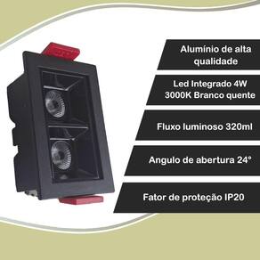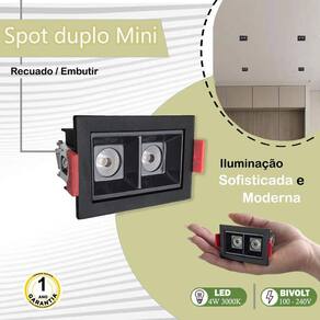Um spot mini recuado duplo com LED integrado em branco quente é uma excelente escolha para quem busca uma iluminação discreta, eficiente e elegante em ambientes internos. O spot é recuado, ou seja, fica embutido no teto, oferecendo um visual limpo e discreto. O formato duplo permite dois pontos de luz em um único módulo, otimizando o espaço, por ser recuado e possuir dois focos de luz, o spot garante uma iluminação bem distribuída, evitando sombras fortes ou áreas mal iluminadas.