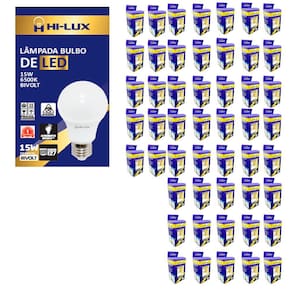 90 - LÂMPADAS LED BULBO 15W 6500KA linha de lâmpadas LED HILUX é indicada para retrofit de lâmpadas incandescentes ou fluorescentes, em diversos tipos de aplicações para ambientes internos.PROPRIEDADES¿ Lâmpadas certificadas pelo INMETRO.¿ Formato similar às lâmpadas incandescentes tradicionais.¿ Corpo em policarbonato branco e difusor em policarbonato branco leitoso.¿ Possui driver interno isolado.CARACTERÍSTICAS DE FUNCIONAMENTO¿ Temperatura ambiente: -5°C a 40°C.¿ Tensão de entrada: 100V a 240V.ESPECIFICAÇÕES TÉCNICAS¿ Base : E27¿ Tensão : Bivolt Automático 100V - 240V¿ Ângulo de abertura : 180 graus¿ Potência : 15W¿ Fluxo Luminoso : 1350 Lumens¿ Temperatura de cor : 6500K¿ Emissão de cor : Branca¿ Equivalência : Incandescente 75w / Fluorescente 20W¿ Dimensões : 108mm x 60mm
