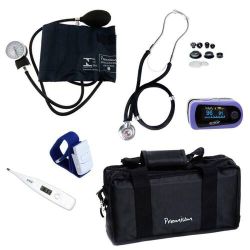 Kit Acadêmico Esfigmomanômetro + Esteto + Oximetro + Termômetro + Garrote + Bolsa O Kit Acadêmico Premium é ideal para estudantes e profissionais da área da saúde.Em uma prática bolsa multi-uso na cor preta, estão acondicionados um Esfigmomanômetro Aneróide com braçadeira em Fecho de Contato (com estojo), um estetoscópio Rappaport (com acessórios), Oximetro de Led com Curva Gtech, Garrote tamanho adulto e um Termômetro clínico digital.O kit vem com o estetoscópio preto e o esfigmomanômetro azul marinho.Características:O Esfigmomanômetro Premium (aparelho de pressão) é verificado e aprovado pelo Inmetro, possui manguito com pera em PVC, muito mais resistente e não provoca alergias, braçadeira em nylon com tamanho de 18 a 35 cm com fecho de Contato.-Verificado e aprovado pelo Inmetro.-Manguito com pera em PVC.-Braçadeira em Nylon.-Fecho de Contato.-Estojo para viagem.Estetoscópio Rappaport:O estetoscópio Rappaport Premium, é produzido com os materiais mais nobres, possui tubo duplo para ausculta mais precisa e diafragmas e olivas para diferentes configurações.-Inclui olivas e diafragmas para conversão em diferentes formas de uso.-Tubo duplo para ausculta mais precisa.-Acabamento em aço cromado.Termômetro Clínico Digital: Ponta flexível, mais conforto.• Verificados e aprovados pelo INMETRO.• 100% resistentes à água.• Beep sonoro de aviso de medição.• Display LCD de fácil visualização.• Alarme de febre.• Memória da última medição.• Desligamento automático.- Indicador de bateria fraca. Garrote: Eficiente em procedimentos médico-hospitalares ambulatoriais que requeiram imobilização ou garroteamento do membro superior e inferior.• Fecho em PVC, que permite um ajuste fácil e confortável.• Tamanho Adulto Oxímetro De Led G-Tech O Oxímetro G-TECH é de alta precisão e pode ser utilizado tanto por profissionais de saúde como no ambiente doméstico para monitorização da porcentagem de saturação e dos batimentos cardíacos por minuto. Tipo de oxímetro: DedoKit de acessórios:1 Oxímetro de Pulso G-Tech.1 Estojo1 Capa de proteção em silicone.1 Cordão2 Pilhas AAA. Bolsa Multi UsoIdel para acondicionar todos os itens30- Centímetros de comprimento15- Centímetro de altura10- Centímetros de Profundidade Itens Inclusos:1 Estetoscópio Rappaport Duplo Preto Com Acessórios;1 Oximetro LED G Tech Completo1 Esfigmomanômetro Azul Marinho Com Estojo1 Válvula de deflação;1 Pêra;1 Termômetro Digital Axiliar Branco;1 Garrote Azul;1 Bolsa Multi uso.Manual de Instruções
