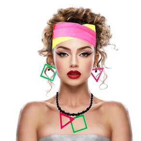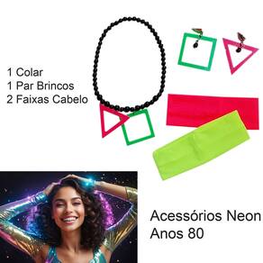 Kit Acessório Fantasia Anos 80 Vintage Neon New Wave Festa Carnaval: Faixa Cabelo + Colar + Brincos = 4 Produtos. Composto por: 2 faixas de cabeça coloridas. 1 Colar colorido com figuras geométricas. 1 Par de Brincos coloridos combinando com o colar. Cores Neon que foram tendência nos anos 80. Esses acessórios são super temáticos e vão incrementar ainda mais o seu visual e sua fantasia. Atenção: Produto de alto giro. Recebemos novas remessas semanalmente e algum detalhe pode variar conforme o lote recebido, porém o produto é o mesmo e mantém as mesmas características e qualidade. Contém: 2 Faixas Cabeça + 1 Colar + 1 Par Brincos = Total de 4 produtos temáticos. Fotos ilustrativas e reais do produto. Não acompanha fantasia.