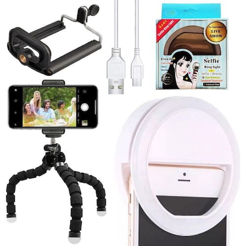 Kit Acessório Youtuber Mini Tripé Suporte Celular Iluminação Kit acessórios youtuber mini tripé flexível suporte celular iluminação luz led anel clip ring light universal smartphone Kit mini tripé flexível + luz mini clip iluminador ring light Kit profissional,completo,de qualidade e com eletrônica.São itens para melhor qualidade de seus vídeos e fotos. O kit contém: 1 mini tripé flexível para celular ou câmera 1 flash selfie recarregável acompanha cabo para recarga com embalagem 1 adaptador de celular para usar no tripé. Compatível com qualquer aparelho celular Clipe com feixes de led para adaptar em tablets, smartphones, notebook ou aonde quer que seja.O clipe funciona com bateria interna, carregado por um cabo usb, com 3 níveis diferentes de led; fraco, médio e forte. Utilize como desejar -mude a iluminação de suas selfies com essa incrível novidade e registre os momentos únicos com mais luz e brilho. -iluminação forte porem não danifica sua visão, pode ser transportado facilmente no bolso ou qualquer outro compartimento. Compatível: o clipe é universal, sem restrições. Pode ser até que sua abertura para prender seja compatível; em geral, o clipe é compatível com a grande maioria de smartphones e alguns tablets. Especificações: - 3 ajustes de cor: baixo, médio e forte - luz branca fria - temperatura da cor: 5000k - 7000k - índice de cor de renderização: =95% Homologação Anatel: 136132205567 Marca: Não Informado Ean: 7890332562542