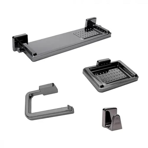 Informações técnicas: Cor: Cinza Fumê Acabamento: Brilhante Composição: Plástico PP e PSAI Fixação: - Saboneteira, papeleira e gancho: adesiva - Porta-shampoo: encaixe Fixação adesiva ideal para superfícies de: Vidro, porcelanatos, granitos, pisos cerâmicos e mármores Dimensões C x A x L : - Porta Shampoo: 30cm x 4,5cm x 10cm - Saboneteira: 14cm x 9,7cm x 3,9cm - Porta Papel Higiênico: 13,7cm x 3,9cm x 8,8cm - Gancho: 3,8cm x 4,5cm x 3,6cm