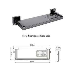 O kit acompanha: - 1 Porta Shampoo - 1 Saboneteira com adesivo - 1 Porta Papel Higiênico com adesivo - 1 Gancho com adesivo - 5 fixadores e 4 buchas para fixação do porta shampoo Marca: Não Informado