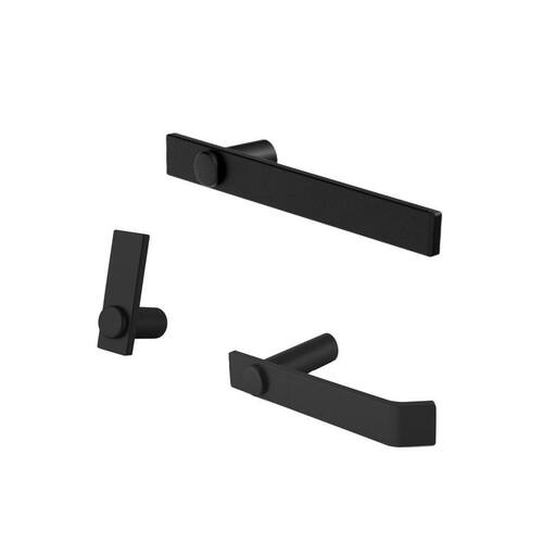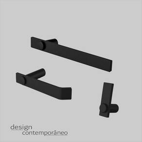 - linha: patmos - modelo: kit 3 peças - cor e acabamento: preto fosco acetinado - tecnologia: parafusos com dupla fixação - dimensões: vide imagem - itens enviados: 1 cabide, 1 porta papel higiênico, 1 porta toalha 25cm e kit de acessórios para instalação. enviamos manual de instalação