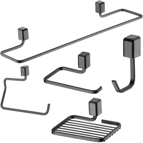Conteúdo: 1 porta papel higiênico, 1 porta toalha de rosto, 1 porta toalha de banho, 1 saboneteira e 1 gancho multiuso;