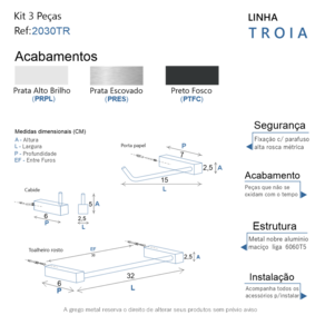 ITENS ENVIADOS: 1 cabide, 1 porta papel higiênico, 1 toalheiro rosto 30cm, kit de parafusos e manual instrução instalação.
