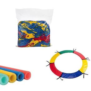 Este kit básico de acessórios para cama pula pula 1,83m acompanha 1 rede de proteção em malha 11 fio 5.1, 6 isotubos blindados multicoloridos e 1 proteção de molas com revestimento em PVC impermeável (ou seja, não absorve água).