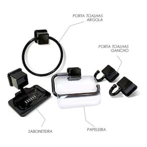 Kit Banheiro com 5 Peças Esse kit é perfeito para deixar seu banheiro mais organizado e elegante. Feito em polipropileno na cor Preta, com excelente resistência e durabilidade. O kit acompanha:1 Saboneteira, 1 Porta Toalhas Argola, 2 Porta Toalhas Gancho Simples e 1 Papeleira ESPECIFICAÇÕES:Material: Plástico resistenteFácil InstalaçãoVem com 5 Parafusos e 5 Buchas para fixação CONTÉM:01 Kit para Banheiro com 5 Peças na cor Preta Kit Banheiro com 5 Peças Esse kit é perfeito para deixar seu banheiro mais organizado e elegante. Feito em polipropileno na cor Preta, com excelente resistência e durabilidade. O kit acompanha:1 Saboneteira, 1 Porta Toalhas Argola, 2 Porta Toalhas Gancho Simples e 1 Papeleira ESPECIFICAÇÕES:Material: Plástico resistenteFácil InstalaçãoVem com 5 Parafusos e 5 Buchas para fixação CONTÉM:01 Kit para Banheiro com 5 Peças na cor Preta