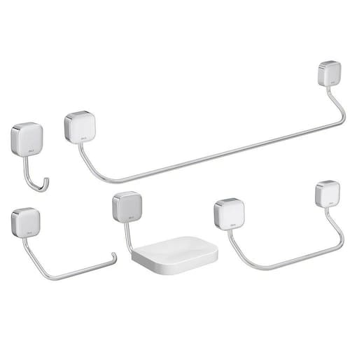 Contém Saboneteira, Papeleira, Porta Toalha Argola, Porta Toalha Barra e Cabide