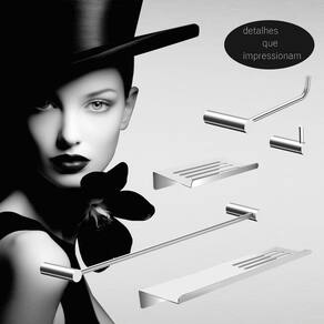 ITENS ENVIADOS: 1 cabide, 1 porta papel higiênico, 1 toalheiro rosto 30cm, 1 toalheiro duplo 60cm, 1 prateleira suporte canto 30cm, kit de parafusos e manual instrução instalação.
