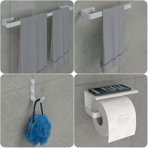 As peças do kit possuem um design clean e sofisticado, suas barras são de alumínio maciço, o porta shampoo e porta sabonetes são de aço inox, ambos com acabamento em pintura eletrostática epóxi branca garantindo maior durabilidade e resistência, não havendo problemas com ferrugem.