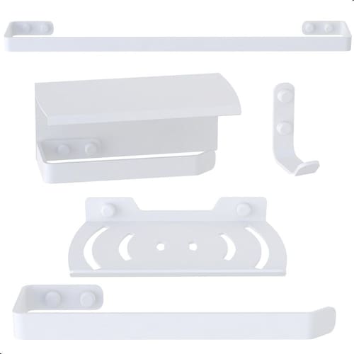 Kit Acessórios Para Banheiro Branco 5 Peças Zmt Banheiros modernos exigem produtos de qualidade. Prezando pela sofisticação e elegância, desenvolvemos o Kit Acessórios Para Banheiro Zermatt, onde cada traço foi cuidadosamente desenhado para deixar seu banheiro com um visual clean e sofisticado. Com um design minimalista, o preferido pelos arquitetos nos últimos tempos, o Kit Acessórios Para Banheiro é fabricado utilizando Aço Inox e Alumínio Maciço com acabamento em Pintura Eletrostática Epóxi proporcionando maior durabilidade, resistência e garantindo que não ocorrerá oxidação nem ferrugem. O sistema de dupla fixação garante mais firmeza ao produto e mais estabilidade, evitando que a peça se desloque de um lado para a outro. BENEFÍCIOSFixação forte: Sistema duplo de fixaçãoAcabamento Premium: Corte Realizado à LaserMaterial de Aço Inox e Alumínio MaciçoResistente a ÁguaNão Enferruja e não sofre oxidaçãoFuros alinhados com parafusos sextavados, facilitando o acesso da ferramenta, tornando a instalação muito simples e rápidaTampa de acabamento para esconder as cabeças dos parafusos ESPECIFICAÇÕES TÉCNICASMaterial: Aço Inox e Alumínio MaciçoAcabamento: Pintura Eletrostática EpoxiCor: BrancoQuantidade de Peças do Kit: 05 MEDIDASAltura x Largura x ProfundidadePorta Toalha de Banho: 1,6cm x 44cm x 7cmPorta Toalha de Rosto: 1,6cm x 21,5cm x 7cmPorta Papel Higiênico: 16cm x 14,5cm x 7cmGancho: 6,5cm x 1,6cm x 5,5cmSaboneteira: 1,5cm x 14cm x 8cm ITENS INCLUSOS1 Porta Toalha de Banho1 Porta Toalha de Rosto1 Porta Papel Higiênico1 Gancho1 SaboneteiraParafusos e buchas para instalaçãoTampas para esconder os parafusos Todos os itens acompanham parafusos, buchas e tampas de acabamento para esconder a cabeça do parafuso.