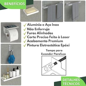 As peças do kit possuem um design clean e sofisticado, suas barras são de alumínio maciço, o porta shampoo e porta sabonetes são de aço inox, ambos com acabamento em pintura eletrostática epóxi branca garantindo maior durabilidade e resistência, não havendo problemas com ferrugem.