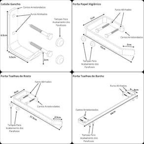 Todos os itens acompanham parafusos, buchas e tampas de acabamento para esconder a cabeça do parafuso.
