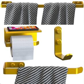 Material Reforçado - Aço carbono de alta resistência, ideal para uso diário Não Enferruja Fácil - Acabamento premium que protege contra umidade e corrosão Design Clean e Sofisticado - Cor Dourada para um visual moderno e elegante Instalação Prática - Furos alinhados, parafusos sextavados e tampas de acabamento para um acabamento impecável Funcional - porta papel higiênico com prateleira superior para apoiar celular, aromatizador ou pequenos itens decorativos