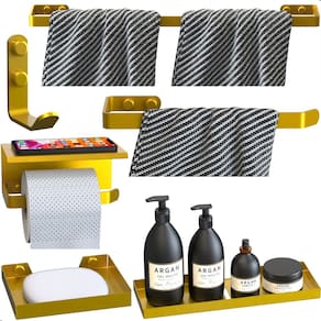 Transforme seu banheiro em um ambiente organizado, moderno e sofisticado com o Kit Acessórios Para Banheiro Dourado 6 Peças Max. Produzido em aço carbono de alta qualidade, com pintura eletrostática epóxi Dourada, este kit une resistência, durabilidade e elegância para o seu dia a dia.