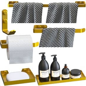 Transforme seu banheiro em um ambiente organizado, moderno e sofisticado com o Kit Acessórios Para Banheiro Dourado 6 Peças Plus. Produzido em aço carbono de alta qualidade, com pintura eletrostática epóxi Dourada, este kit une resistência, durabilidade e elegância para o seu dia a dia.