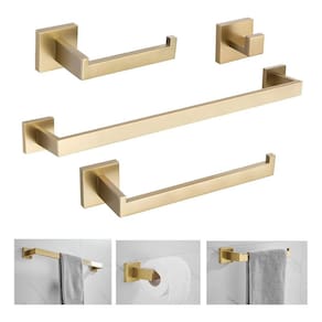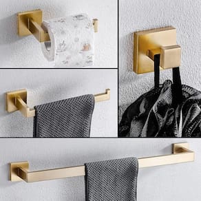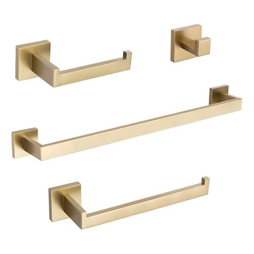 Cor: dourado Material: aço inoxidável 304 Espessura das peças: 1 cm. Tipo de fixação: dupla com parafusos Itens inclusos: papeleira, cabide, porta toalha de rosto e porta toalha de banho. Acompanha: parafusos e buchas para instalação Marca: Revomax Ean: 7894903628576