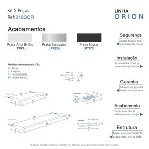 ITENS ENVIADOS: 1 cabide, 1 porta papel higiênico, 1 toalheiro rosto 30cm, 1 toalheiro banho 50cm, 1 saboneteira, kit de parafusos e manual instrução instalação.