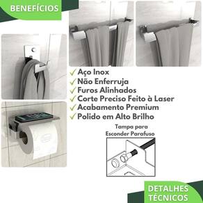 Com um design minimalista, o preferido pelos arquitetos nos últimos tempos, o Kit Acessórios Para Banheiro é fabricado utilizando aço inox com acabamento polido em alto brilho proporcionando maior durabilidade, resistência e garantindo que não ocorrerá oxidação nem ferrugem.