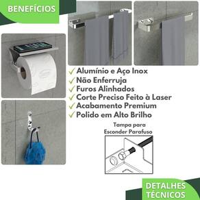 Ter um banheiro organizado traz leveza e praticidade para sua rotina. Para que o banheiro fique em ordem, é necessário o uso de alguns produtos. O Kit de Acessórios para Banheiro MAX é super indicado pois contém 4 peças para a harmonização do seu ambiente. As peças do kit possuem um design clean e sofisticado, suas barras são de alumínio maciço cromadas, o porta shampoo e porta sabonete são de aço inox, ambos com acabamento cromado, garantindo maior durabilidade e resistência, não havendo problemas com ferrugem. BENEFÍCIOS Não Enferruja Resistente a Água Acabamento Premium Tampa de acabamento para esconder as cabeças dos parafusos Furos alinhados com parafusos sextavados, facilitando o acesso da ferramenta, tornando a instalação muito simples e rápida ESPECIFICAÇÕES TÉCNICAS Material do Porta Shampoo e Porta Sabonete: Aço Inox Material das Outras Peças: Barra Chata de Alumínio Maciço Acabamento: Cromado Cor: Prateado Alto Brilho Largura da barra chata:16mm Espessura da barra chata: 4mm Quantidade de Peças do Kit: 04 MEDIDAS. Gancho: Altura 6.5cm x Profundidade 5.5cm x Largura 1.6cm Porta Papel Higiênico: Altura 6.5cm x Profundidade 9cm x Largura 15cm Porta Toalha de Rosto: Altura 1.6cm x Profundidade 6cm x Largura 21cm Porta Toalha de Banho: Altura 1.6cm x Profundidade 6cm x Largura 44cm Itens Inclusos: 01 UN - Porta Toalhas de Rosto MAX Cromado 01 UN - Porta toalhas de Banho MAX Cromado 01 UN - Porta Papel Higiênico MAX Cromado 01 UN - Gancho MAX Cromado Todos os itens acompanham parafusos, buchas e tampas de acabamento para esconder a cabeça do parafuso. Marca: HomeFull