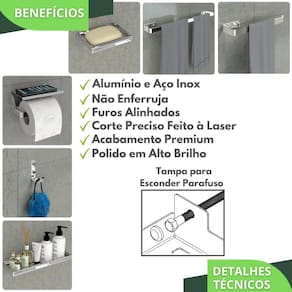 Ter um banheiro organizado traz leveza e praticidade para sua rotina. Para que o banheiro fique em ordem, é necessário o uso de alguns produtos. O Kit de Acessórios para Banheiro MAX é super indicado pois contém 6 peças para a harmonização do seu ambiente. As peças do kit possuem um design clean e sofisticado, suas barras são de alumínio maciço cromadas, o porta shampoo e porta sabonete são de aço inox, ambos com acabamento cromado, garantindo maior durabilidade e resistência, não havendo problemas com ferrugem. BENEFÍCIOS Não Enferruja Resistente a Água Acabamento Premium Tampa de acabamento para esconder as cabeças dos parafusos Furos alinhados com parafusos sextavados, facilitando o acesso da ferramenta, tornando a instalação muito simples e rápida ESPECIFICAÇÕES TÉCNICAS Material do Porta Shampoo e Porta Sabonete: Aço Inox Material das Outras Peças: Barra Chata de Alumínio Maciço Acabamento: Cromado Cor: Prateado Alto Brilho Largura da barra chata:16mm Espessura da barra chata: 4mm Quantidade de Peças do Kit: 06 MEDIDAS. Gancho: Altura 6.5cm x Profundidade 5.5cm x Largura 1.6cm Porta Papel Higiênico: Altura 6.5cm x Profundidade 9cm x Largura 15cm Porta Toalha de Rosto: Altura 1.6cm x Profundidade 6cm x Largura 21cm Porta Toalha de Banho: Altura 1.6cm x Profundidade 6cm x Largura 44cm Porta Sabonete: Altura 1.5cm x Profundidade 8cm x Largura 10cm Porta Shampoo: Altura 1.5cm x Profundidade 8cm x Largura 23cm Itens Inclusos: 01 UN - Porta Toalhas de Rosto MAX Cromado 01 UN - Porta toalhas de Banho MAX Cromado 01 UN - Porta Papel Higiênico MAX Cromado 01 UN - Porta Shampoo MAX Cromado 01 UN - Porta Sabonete MAX Cromado 01 UN - Gancho MAX Cromado Todos os itens acompanham parafusos, buchas e tampas de acabamento para esconder a cabeça do parafuso. Marca: HomeFull