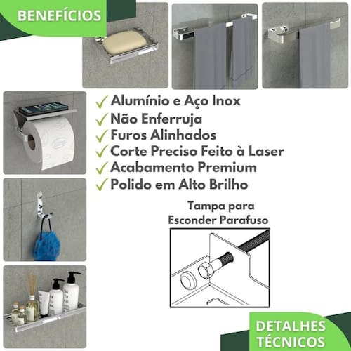 As peças do kit possuem um design clean e sofisticado, suas barras são de alumínio maciço cromadas, o porta shampoo e porta sabonete são de aço inox, ambos com acabamento cromado, garantindo maior durabilidade e resistência, não havendo problemas com ferrugem.