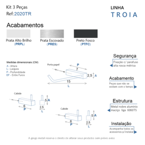 ITENS ENVIADOS: 2 cabides, 1 porta papel higiênico, kit de parafusos e manual instrução instalação.