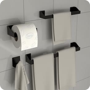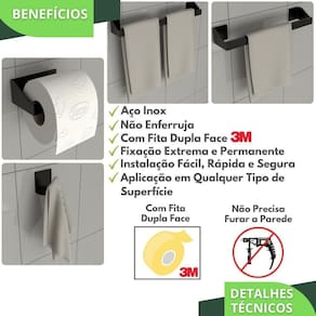 Kit Acessórios Para Banheiro Preto 4 Peças Master Slim DF O Kit Acessórios Para Banheiro Dupla Face foi projetado para quem não quer furar a parede e busca por qualidade na fixação e boa aderência em ambientes molhados. Prezando pela sofisticação e elegância, cada traço do produto foi cuidadosamente desenhado para deixar seu banheiro com um visual clean e sofisticado.