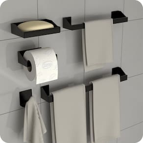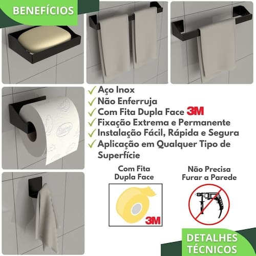 Kit Acessórios Para Banheiro Preto 5 Peças Master Slim DF O Kit Acessórios Para Banheiro Dupla Face foi projetado para quem não quer furar a parede e busca por qualidade na fixação e boa aderência em ambientes molhados. Prezando pela sofisticação e elegância, cada traço do produto foi cuidadosamente desenhado para deixar seu banheiro com um visual clean e sofisticado.