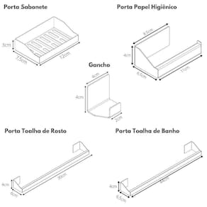 MEDIDAS Porta Toalha de Banho: 5cm x 44cm x 5,5cm Porta Toalha de Rosto: 5cm x 30cm x 5,5cm Porta Papel Higiênico: 9cm x 15cm x 6cm Gancho: 3,5cm x 3cm x 4,5cm Saboneteira: 3,5cm x 12cm x 7,5cm