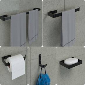 As peças do kit possuem um design clean e sofisticado, suas barras são de alumínio maciço e a grade do porta sabonete é de aço inox, ambos com acabamento em pintura eletrostática epóxi preto fosco garantindo maior durabilidade e resistência, não havendo problemas com ferrugem.